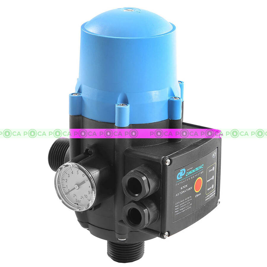 Блок автоматики для насоса ДЖИЛЕКС регулирует процесс подачи воды по потоку и давлению и защищает насос от «сухого хода». Выдерживает давление не более 10 атмосфер. Блок монтируется на выходе насоса или в напорном трубопроводе. Присоединительный размер — 1.