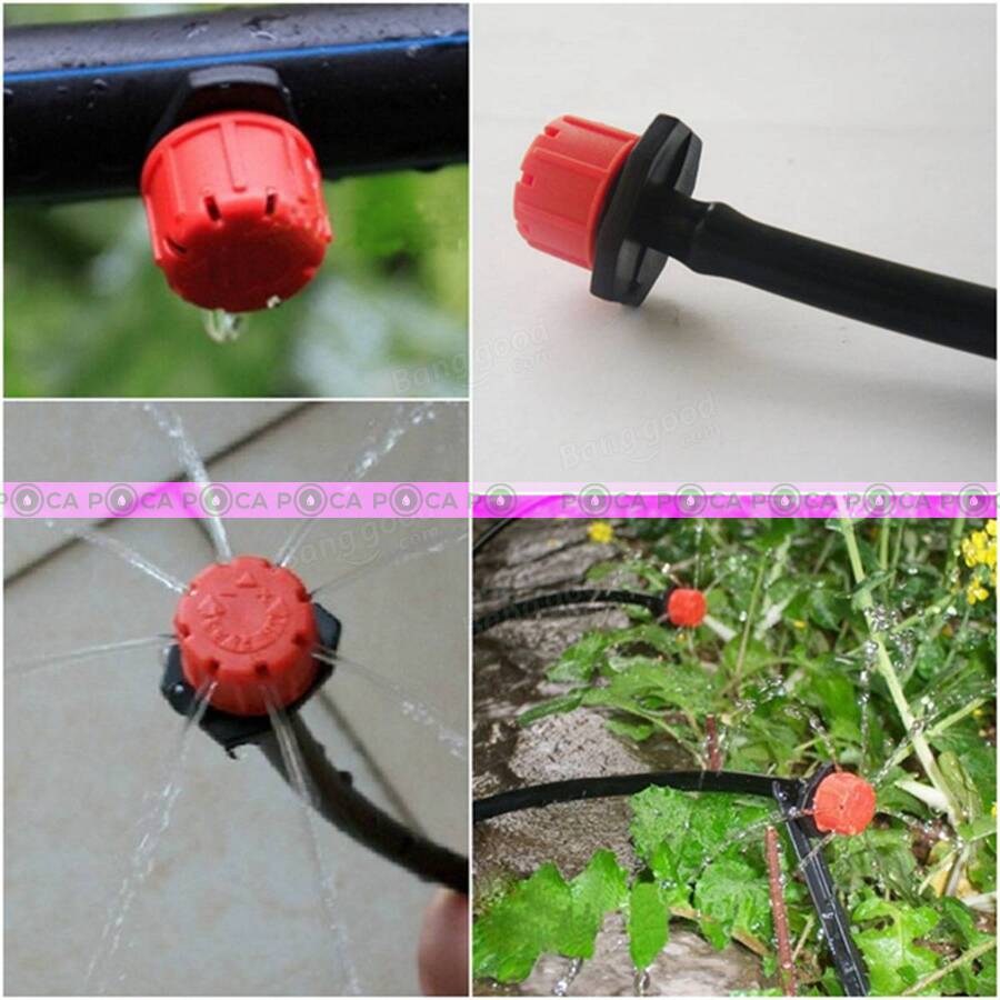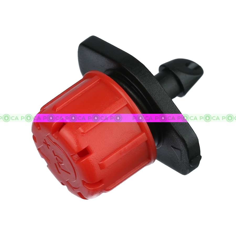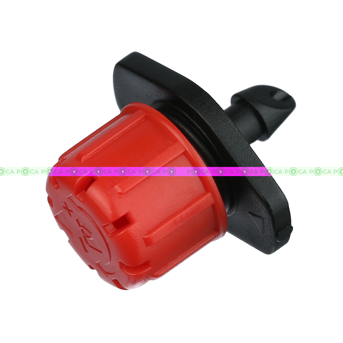 Регулируемая капельница-дождеватель высокой производительности (от 0 до 70 л/ч). Позволяет при необходимости регулировать скорость полива в нужных местах. Может работать в режиме дождевателя (радиус в зависимости от подаваемого давления - до 1,5 м, количество струй - 8, направлены радиально). В режиме капельницы вылив от 0 до 16 литров в час (вылив от 8 литров в час представляет собой тонкую струю). Капельница состоит из двух частей, корпуса и крышки, на обоих нарезана резьба. Дополнительных резиновых уплотнений внутри капельницы не предусмотрено, поэтому "нулевой" вылив не всегда означает полную герметичность, особенно в системах под давлением. Капельница используется в самотёчных системах в режиме капельницы и мини-дождевателя (при высоте бочки 2 метра над землёй диаметр "зонтика" может составлять до 20 см), и в системах с давлением в режиме капельницы или дождевателя с диаметром орошаемой зоны до 3 метров. Диаметр ёршика штуцера 5 мм, диаметр отверстия под капельницу в трубе - 3 мм, рекомендуемый пробойник - 3 мм, рекомендуемый внутренний диаметр микротрубки (если капельница используется на отводных поводках) - 3-4,5 мм, пробка для глушения ненужных отверстий после демонтажа капельницы - 4 мм. Цвет колпачка капельницы может немного не совпадать с изображением на фото (в настоящий момент в налиии капельницы с красным колпачком, а не оранжевым).