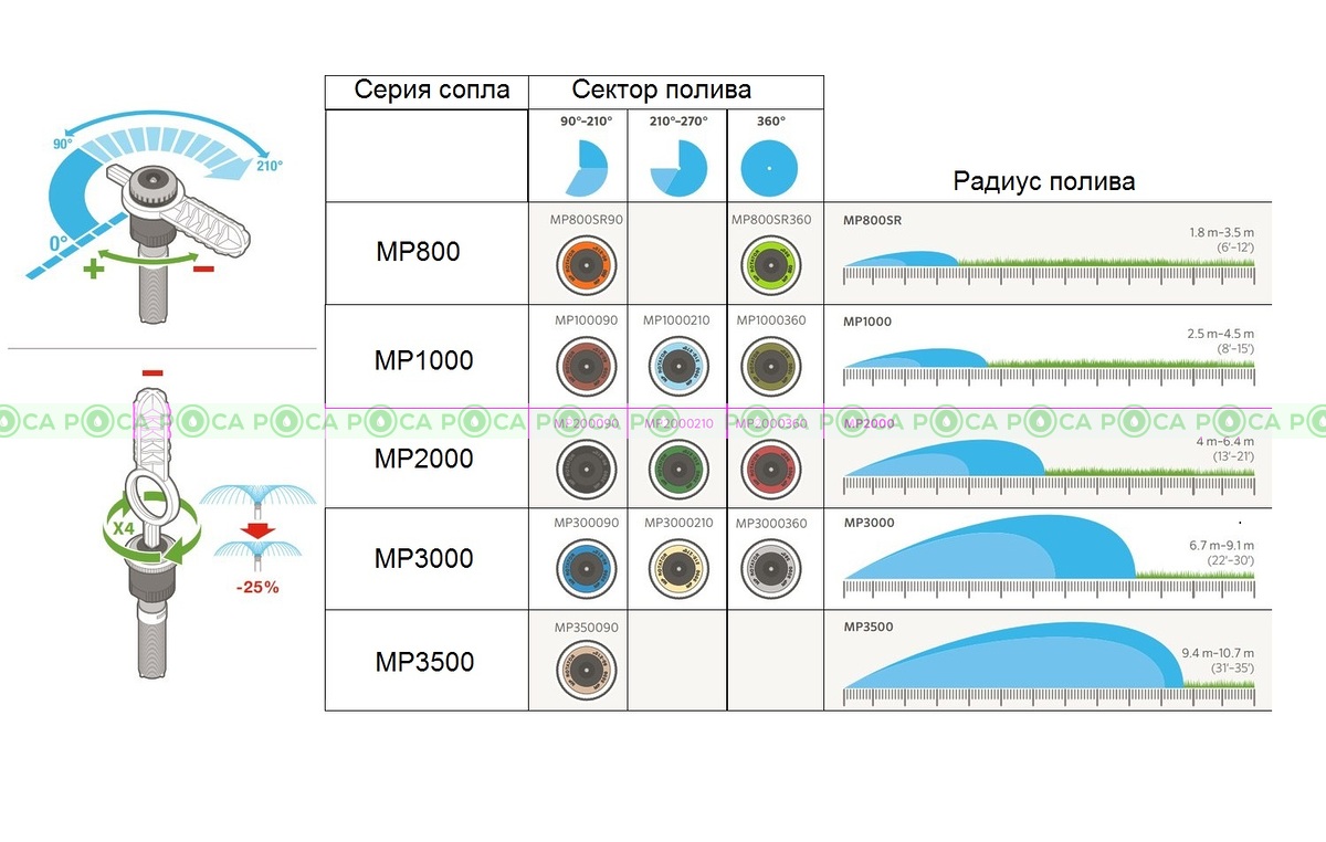 Сопло МР2000 360° Радиус полива от 4,6 до 6,4. Сектор 360гр не регулируется.
